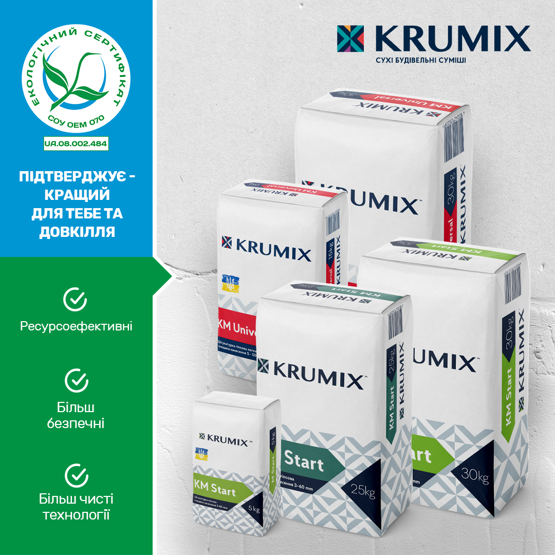 У складі екологічно сертифікованих сумішей будівельних сухих ТМ «КРУМІКС» (KRUMIX) відсутні небезпечні складники з вмістом: летких органічних сполук (ЛОС), азбесту, фосфогіпсу, формальдегіду, органічних сполук олова, галогенованих органічних зв’язуючих компонентів, галогенованих органічних антипіренів, галогенованих органічних або ароматичних розчинників, фталатів з алкильними групами (метил-, етил-, пропил, бутил або октил).