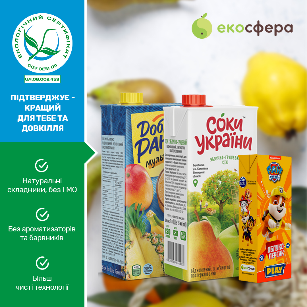 15 найменувань соків виробництва ТОВ «ЕКО-СФЕРА» в черговий раз підтвердили свою відповідність вимогам екологічного стандарту СОУ ОЕМ 08.002.03.011:2020 Плоди та овочі оброблені та законсервовані. Екологічні критерії оцінювання життєвого циклу (сертифікат №UA.08.002.453) за схемою згідно з ДСТУ ISO 14024.