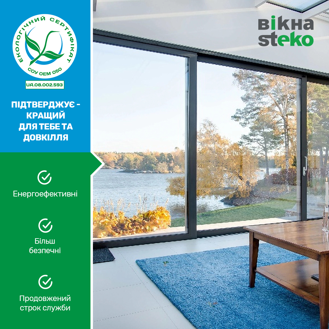 Вікна та двері з полівінілхлоридних профілів та з алюмінієвих сплавів, вітрини та вітражі з алюмінієвих сплавів виробництва ТОВ «Завод Стеко» успішно пройшли екологічну сертифікацію за схемою згідно з ДСТУ ISO 14024 (сертифікат №UA.08.002.593).