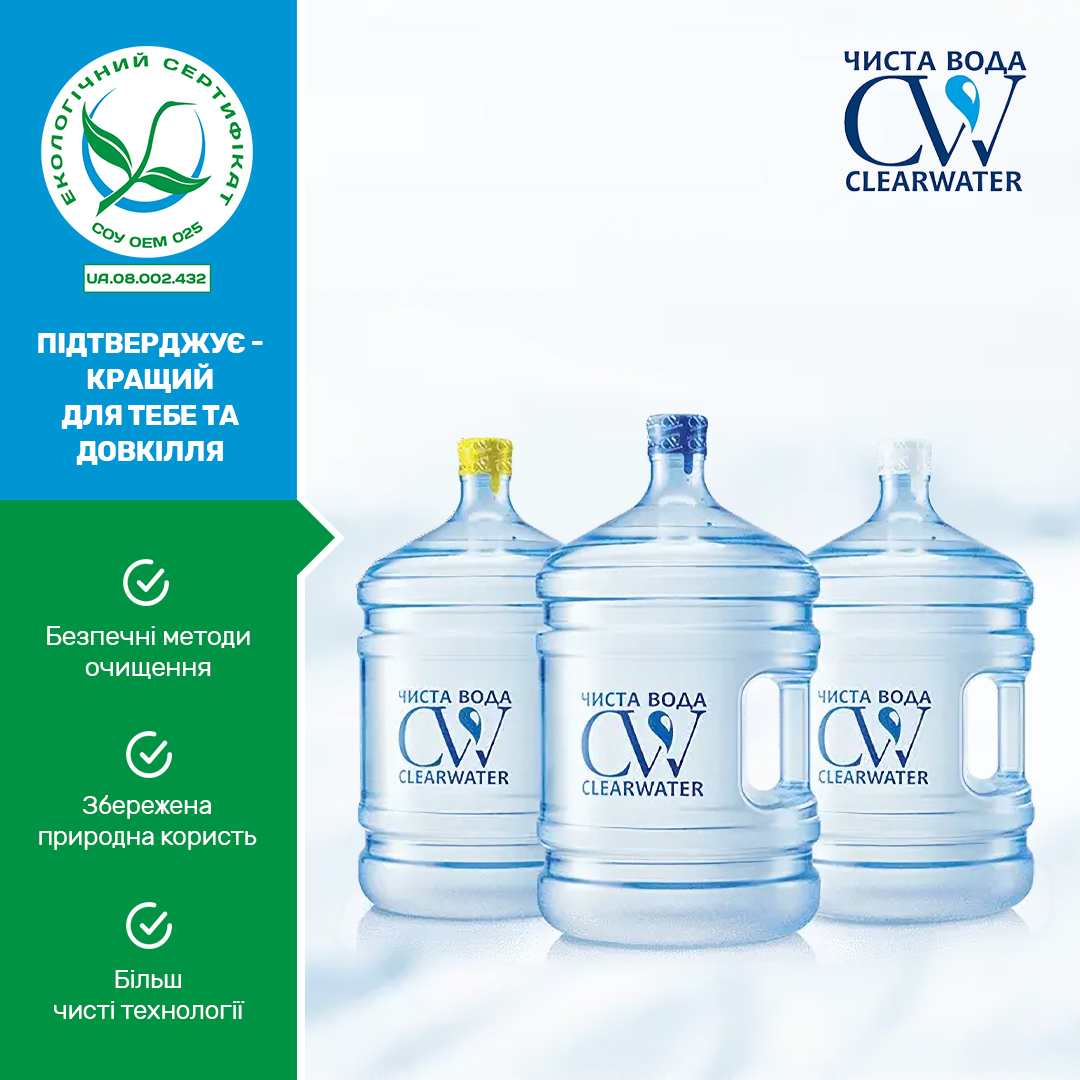 Вода питна негазована «CLEARWATER» «ЧИСТА ВОДА» оброблена, штучно-йодована та штучно-фторована виробництва ТОВ з іноземними інвестиціями «Чиста Вода» в черговий раз успішно підтвердила екологічні переваги та відповідність вимогам СОУ ОЕМ 08.002.03.025:2020 Вода питна фасована. Екологічні критерії оцінювання життєвого циклу за схемою згідно з ДСТУ ISO 14024 (сертифікат №UA.08.002.432).