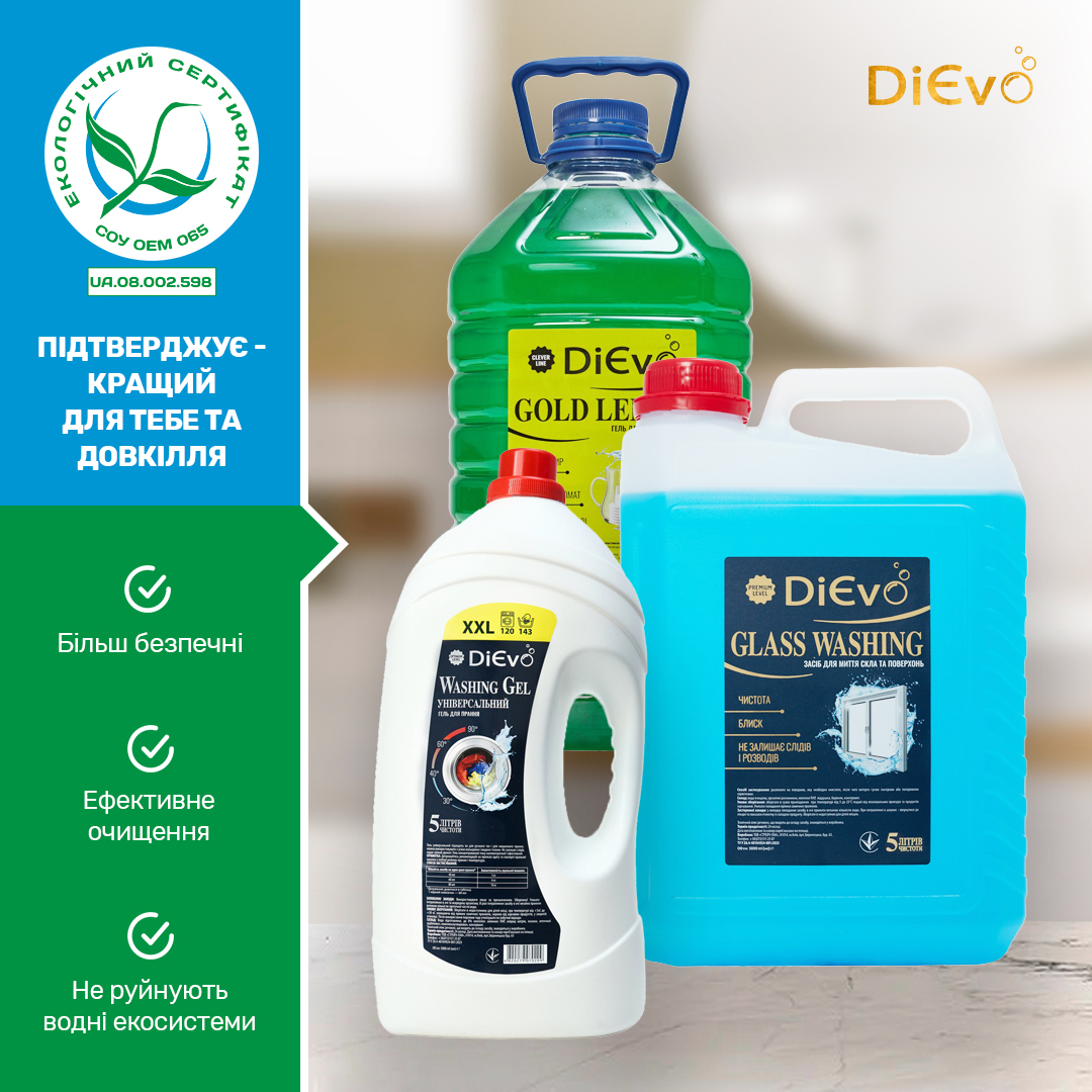 11 найменувань мийних засобів ТМ DiЄvo компанії ТОВ «СТРЕЙЧ-ПАК» підтвердили свою відповідність вимогам СОУ ОЕМ 08.002.12.065:2020 Засоби мийні та засоби для чищення. Екологічні критерії оцінювання життєвого циклу. Оцінювання здійснювалось за схемою згідно ISO 14024.